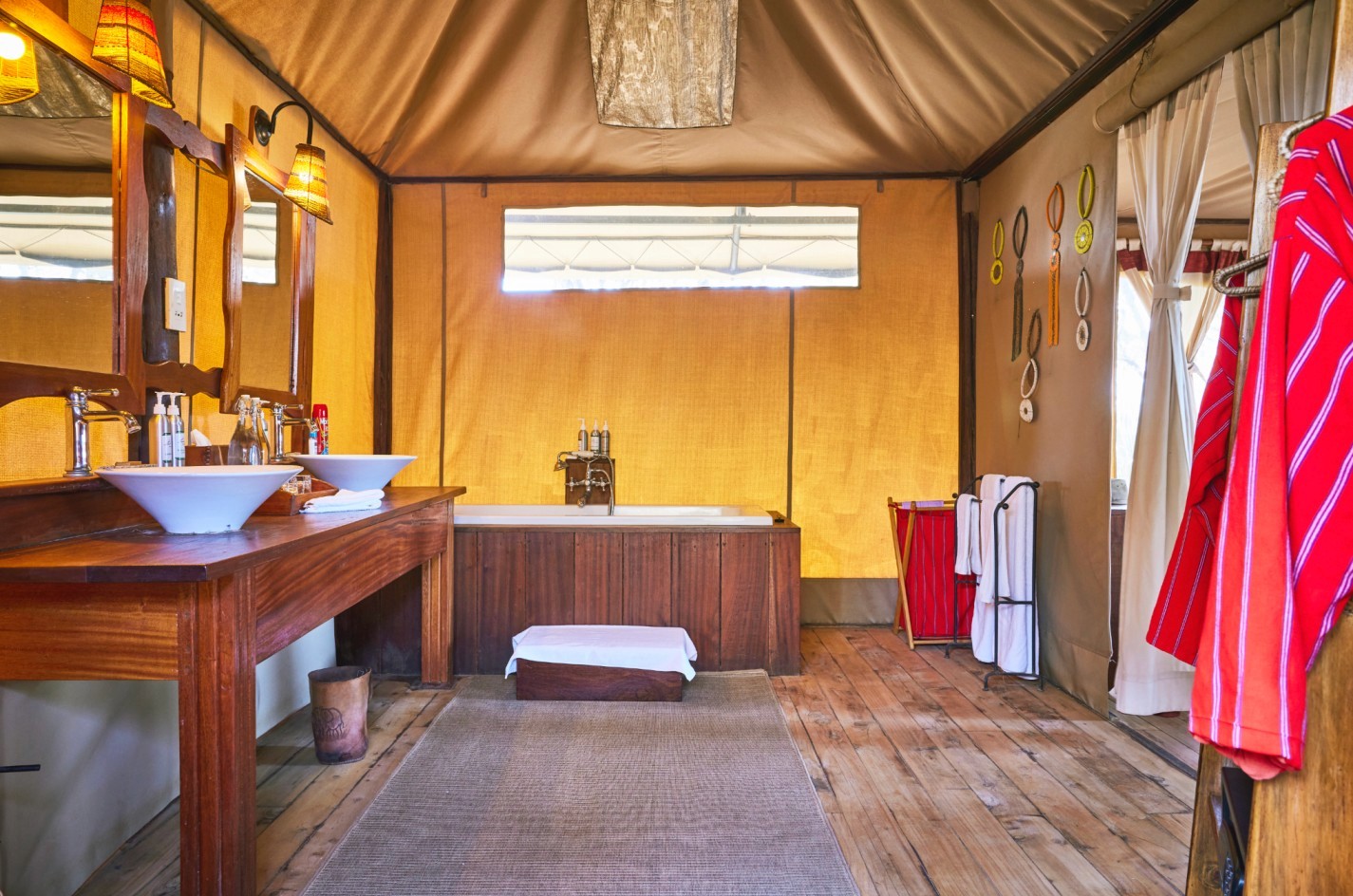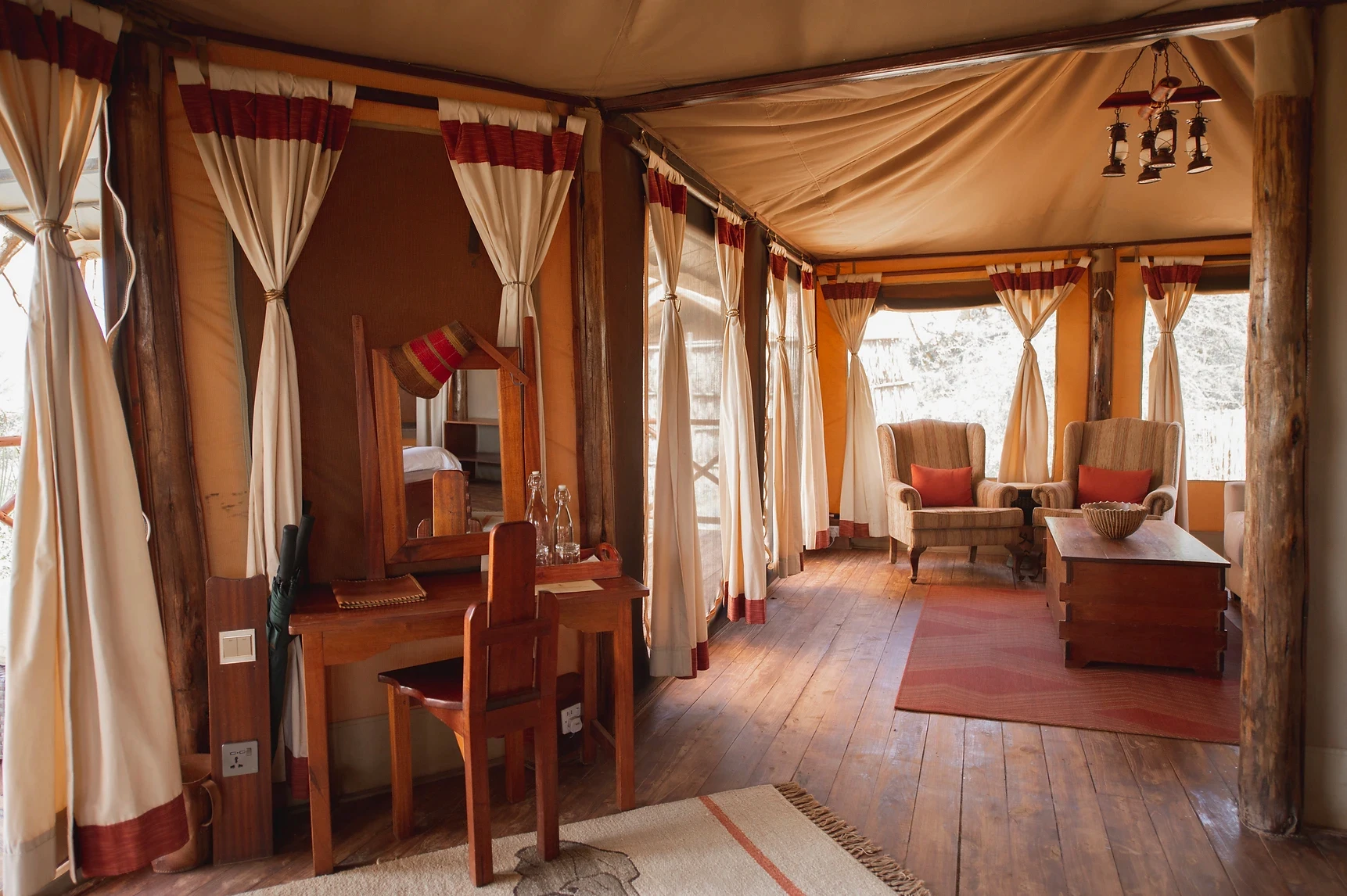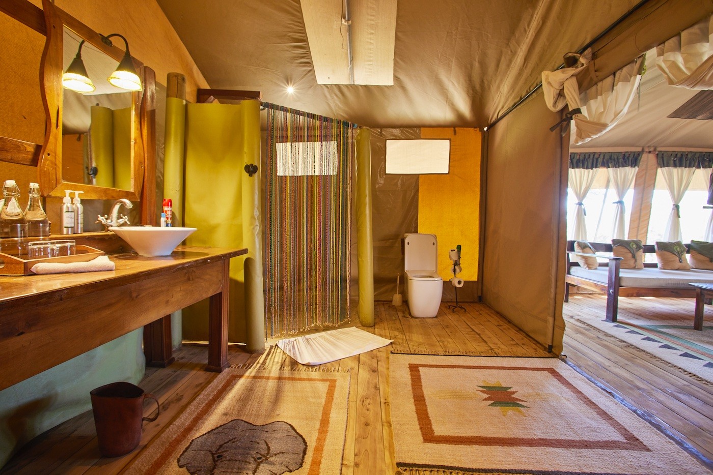 The Deluxe Tent at Elephant Bedroom Camp offers extra space and luxury, featuring a larger plunge pool, a spacious lounge area, and both an indoor shower and outdoor shower. Guests can also enjoy a relaxing soak in the luxurious bathtub. With its enhanced size and thoughtful amenities, the Deluxe Tent provides the perfect blend of comfort and safari charm.